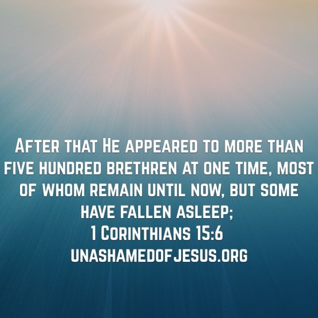 After that He appeared to more than five hundred brethren at one time, most of whom remain until now, but some have fallen asleep; 1 Corinthians 15:6