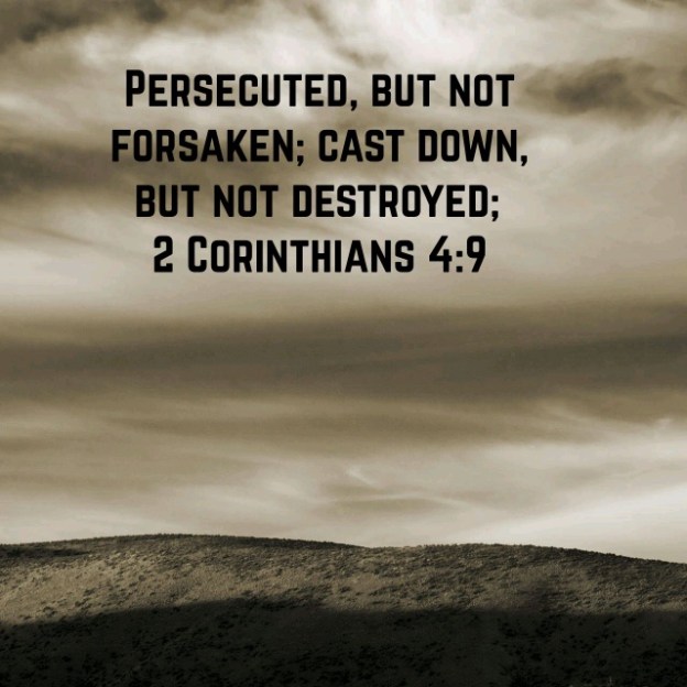 We are troubled on every side, yet not distressed; we are perplexed, but not in despair; Persecuted, but not forsaken; cast down, but not destroyed; 2 Corinthians 4:8-9