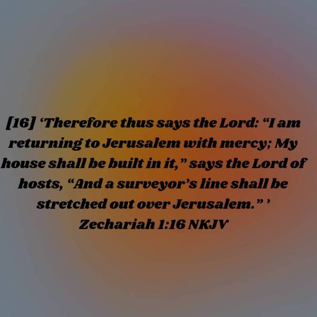 ‘Therefore thus says the LORD: “I am returning to Jerusalem with mercy; My house shall be built in it,” says the LORD of hosts, “And a surveyor’s line shall be stretched out over Jerusalem.” ’ “Again proclaim, saying, ‘Thus says the LORD of hosts: “My cities shall again spread out through prosperity; The LORD will again comfort Zion, And will again choose Jerusalem.” ’ ” Zechariah 16-17