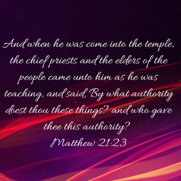 And when he was come into the temple, the chief priests and the elders of the people came unto him as he was teaching, and said, By what authority doest thou these things? and who gave thee this authority? And Jesus answered and said unto them, I also will ask you one thing, which if ye tell me, I in like wise will tell you by what authority I do these things. The baptism of John, whence was it? from heaven, or of men? And they reasoned with themselves, saying, If we shall say, From heaven; he will say unto us, Why did ye not then believe him? But if we shall say, Of men; we fear the people; for all hold John as a prophet. And they answered Jesus, and said, We cannot tell. And he said unto them, Neither tell I you by what authority I do these things. Matthew 21:23-27