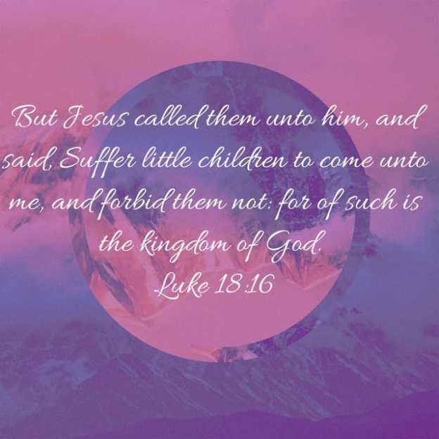 And they brought unto him also infants, that he would touch them: but when his disciples saw it, they rebuked them. But Jesus called them unto him, and said, Suffer little children to come unto me, and forbid them not: for of such is the kingdom of God. Verily I say unto you, Whosoever shall not receive the kingdom of God as a little child shall in no wise enter therein. Luke 18:15-17