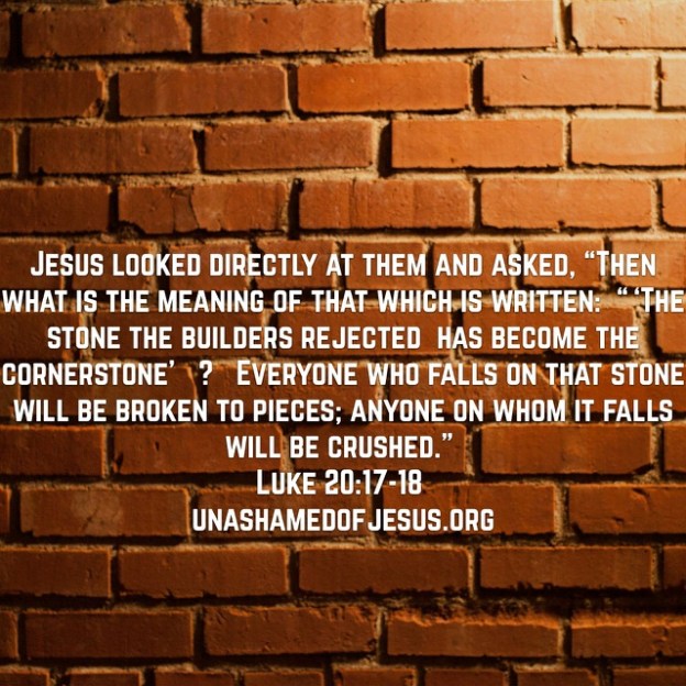 Jesus looked directly at them and asked, “Then what is the meaning of that which is written: “‘The stone the builders rejected has become the cornerstone’?  Everyone who falls on that stone will be broken to pieces; anyone on whom it falls will be crushed.” Luke 20:17-18