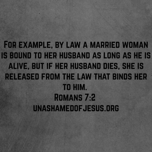 For example, by law a married woman is bound to her husband as long as he is alive, but if her husband dies, she is released from the law that binds her to him. Romans 7:2