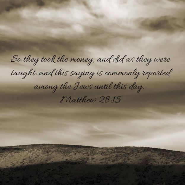 Now when they were going, behold, some of the watch came into the city, and shewed unto the chief priests all the things that were done. And when they were assembled with the elders, and had taken counsel, they gave large money unto the soldiers, Saying, Say ye, His disciples came by night, and stole him away while we slept. And if this come to the governor’s ears, we will persuade him, and secure you. So they took the money, and did as they were taught: and this saying is commonly reported among the Jews until this day. Matthew 28:11-15