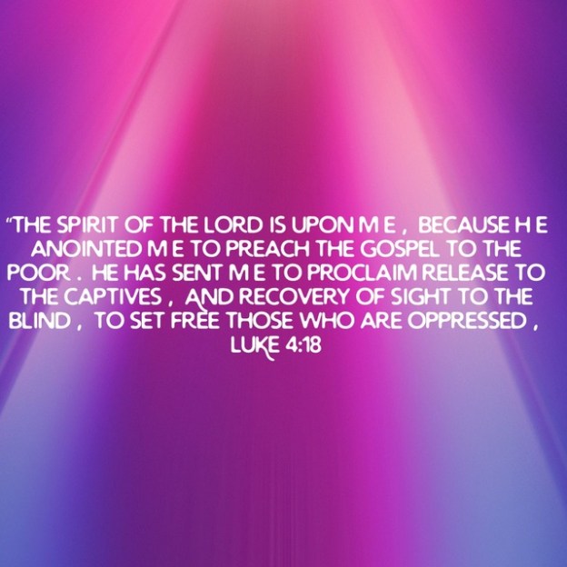THE SPIRIT OF THE LORD IS UPON ME, BECAUSE HE ANOINTED ME TO PREACH THE GOSPEL TO THE POOR. HE HAS SENT ME TO PROCLAIM RELEASE TO THE CAPTIVES, AND RECOVERY OF SIGHT TO THE BLIND, TO SET FREE THOSE WHO ARE OPPRESSED, TO PROCLAIM THE FAVORABLE YEAR OF THE LORD.” Luke 4:18-19