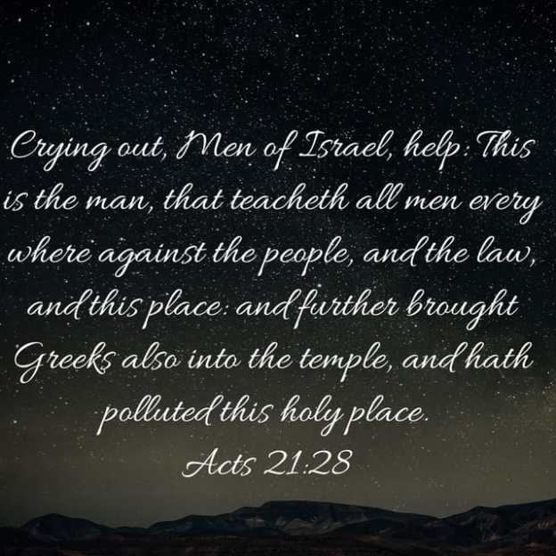 And when the seven days were almost ended, the Jews which were of Asia, when they saw him in the temple, stirred up all the people, and laid hands on him, Crying out, Men of Israel, help: This is the man, that teacheth all men every where against the people, and the law, and this place: and further brought Greeks also into the temple, and hath polluted this holy place. (For they had seen before with him in the city Trophimus an Ephesian, whom they supposed that Paul had brought into the temple.) And all the city was moved, and the people ran together: and they took Paul, and drew him out of the temple: and forthwith the doors were shut. Acts 21:27-30