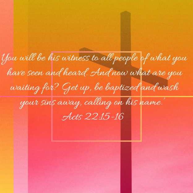 For thou shalt be his witness unto all men of what thou hast seen and heard. And now why tarriest thou? arise, and be baptized, and wash away thy sins, calling on the name of the Lord. Acts 22:15-16