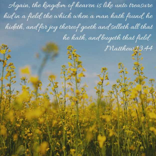 Again, the kingdom of heaven is like unto treasure hid in a field; the which when a man hath found, he hideth, and for joy thereof goeth and selleth all that he hath, and buyeth that field. Again, the kingdom of heaven is like unto a merchant man, seeking goodly pearls: Who, when he had found one pearl of great price, went and sold all that he had, and bought it. Matthew 13:44-46