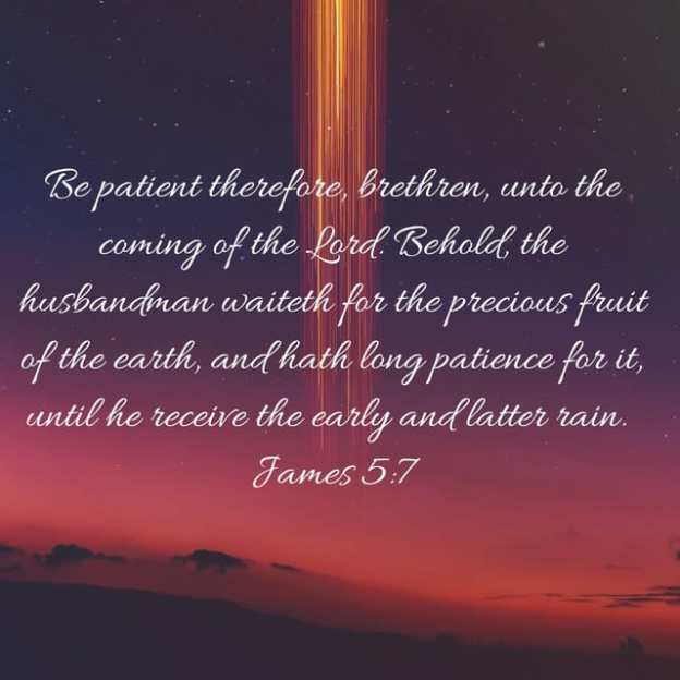 Be patient therefore, brethren, unto the coming of the Lord. Behold, the husbandman waiteth for the precious fruit of the earth, and hath long patience for it, until he receive the early and latter rain. Be ye also patient; stablish your hearts: for the coming of the Lord draweth nigh.James 5:7-8