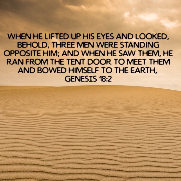 Now the LORD appeared to him by the oaks of Mamre, while he was sitting at the tent door in the heat of the day.  When he lifted up his eyes and looked, behold, three men were standing opposite him; and when he saw them, he ran from the tent door to meet them and bowed himself to the earth, Genesis 18:1-2