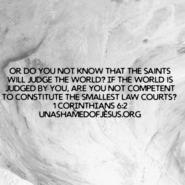 Dare any of you, having a matter against another, go to law before the unjust, and not before the saints? Do ye not know that the saints shall judge the world? and if the world shall be judged by you, are ye unworthy to judge the smallest matters? Know ye not that we shall judge angels? how much more things that pertain to this life? 1 Corinthians 6:1-3