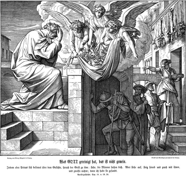 On the morrow, as they went on their journey, and drew nigh unto the city, Peter went up upon the housetop to pray about the sixth hour: And he became very hungry, and would have eaten: but while they made ready, he fell into a trance, And saw heaven opened, and a certain vessel descending unto him, as it had been a great sheet knit at the four corners, and let down to the earth: Wherein were all manner of fourfooted beasts of the earth, and wild beasts, and creeping things, and fowls of the air. And there came a voice to him, Rise, Peter; kill, and eat. Acts 10:9-13