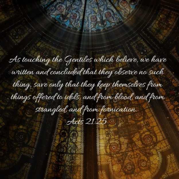 As touching the Gentiles which believe, we have written and concluded that they observe no such thing, save only that they keep themselves from things offered to idols, and from blood, and from strangled, and from fornication. Then Paul took the men, and the next day purifying himself with them entered into the temple, to signify the accomplishment of the days of purification, until that an offering should be offered for every one of them.  Acts 21:25-26