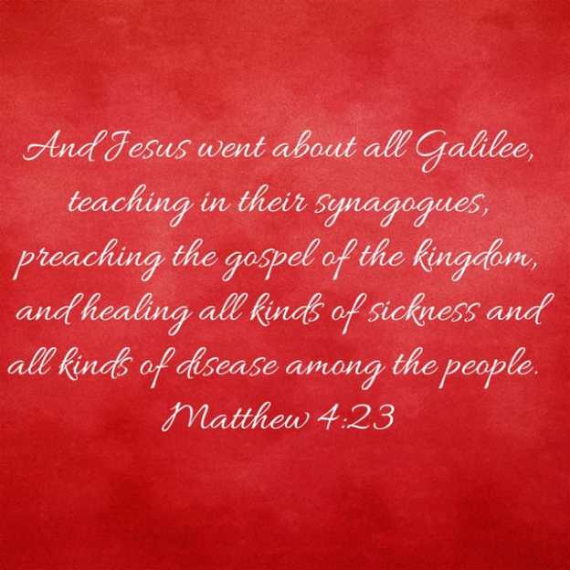 And Jesus went about all Galilee, teaching in their synagogues, and preaching the gospel of the kingdom, and healing all manner of sickness and all manner of disease among the people. And his fame went throughout all Syria: and they brought unto him all sick people that were taken with divers diseases and torments, and those which were possessed with devils, and those which were lunatick, and those that had the palsy; and he healed them. And there followed him great multitudes of people from Galilee, and from Decapolis, and from Jerusalem, and from Judaea, and from beyond Jordan. Matthew 4:23-25