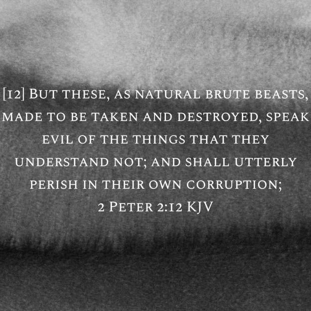 But these, as natural brute beasts, made to be taken and destroyed, speak evil of the things that they understand not; and shall utterly perish in their own corruption; And shall receive the reward of unrighteousness, as they that count it pleasure to riot in the day time. Spots they are and blemishes, sporting themselves with their own deceivings while they feast with you; Having eyes full of adultery, and that cannot cease from sin; beguiling unstable souls: an heart they have exercised with covetous practices; cursed children: 2 Peter 2:12-14