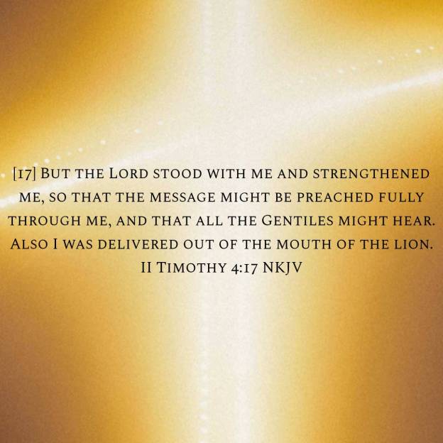 But the Lord stood with me and strengthened me, so that the message might be preached fully through me, and that all the Gentiles might hear. Also I was delivered out of the mouth of the lion. And the Lord will deliver me from every evil work and preserve me for His heavenly kingdom. To Him be glory forever and ever. Amen!  2 Timothy 4:17-18